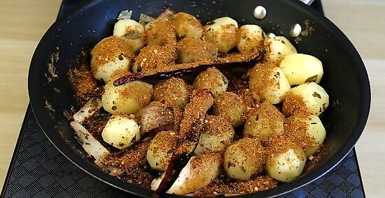 Stir in the masala and fry the potatoes for 5 minutes over medium heat. Pour the masala powder into the skillet and along with salt according to your taste. Stir the potatoes really well so they covered with the spices. Then, fry the potatoes until they're completely crisp. Turn the burner down if the shallots begin to burn.