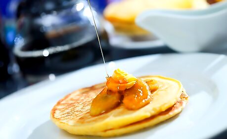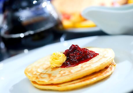 Cook the pancakes. Heat a cast iron skillet or griddle pan on medium heat. Coat the pan in nonstick cooking spray or butter. Pour 1/4 cup of the batter into the pan. Cook for 2-3 minutes. You should see bubbles forming on the top of the batter. Flip the pancake and cook for 1 more minute. The pancake should be lightly golden brown on both sides. Then remove it from the pan. Continue with the rest of the batter. Serve with a generous helping of raspberry compote pour on top of the pancakes. This batter is made to serve four people. While you are cooking the rest of the pancakes, keep the cooked pancakes on a plate in a 200 degree oven to keep them warm.