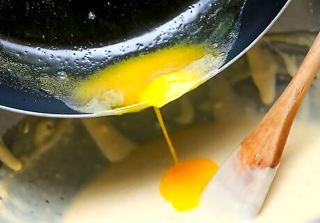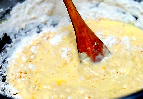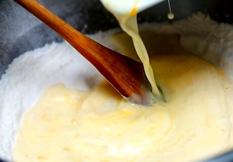 Mix the ingredients. Gradually whisk the wet ingredients into the flour mixture by starting in the middle of the well and whisking outward. Continue to whisk until you have a thick but smooth texture. Add the rest of the buttermilk mixture a little at a time, whisking completely every time you add more. Keep whisking until it is lump free and smooth.