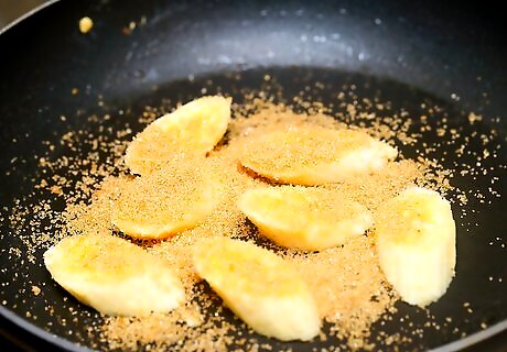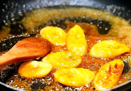 Caramelize the bananas. Add the butter to the sugar and stir. Add in the bananas to the mixture and coat them in the caramel. Cook for 1-2 minutes. The bananas should be slightly golden and slightly tender. Use a knife to check the bananas. If you feel comfortable enough, you can toss the pan slightly to get the bananas covered in the caramel.