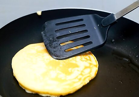 Cook. Drop large dollops on a lightly-greased, hot griddle or heavy frying-pan. Be sure to flip over and cook a few minutes on each side. If you're making a large batch, place the pancakes on an oven-safe plate, and put it in the oven. Add the pancakes to the plate as they finish cooking.
