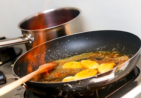 Flambé the bananas. Remove the pan from heat. Pour a generous dash of rum around the pan. Light the pan using a long kitchen match. Put the pan back on the stove. Once the flames subside, stir in the 2 teaspoons of water to help loosen the caramel. The flames will be kind of high at first. Watch to make sure you do not get burnt. Never pour the rum in while it is over an open flame. If you have an electric stove, you don't have to remove the pan from the heat. You have to if you cook on a gas stove because the rum might splash onto the flame and cause a kitchen fire.