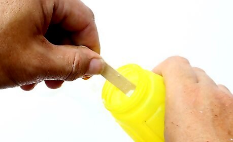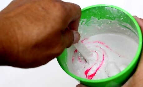 Create your color base in a cup. Combine ½ cup (120 milliliters) of water with 1 to 2 tablespoons (15 to 30 ml) of washable tempera paint. Stir the water with a spoon until the color is even. There should be no streaks. For stronger colors, use more paint. Use less for lighter or pastel colors.
