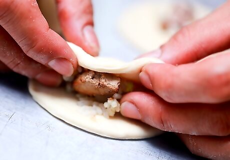 Fold the dough in half, creating a semi-circle. Thoroughly close the edges of the dough around the filling by rolling them in slightly and then pinching them tightly. It is very important the edges be closed to not leak filing into your frying oil and create a big mess.