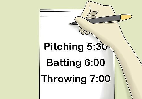 Create a training schedule. The more you practice, the better you get, and you can practice some aspect of baseball every day. Make a weekly schedule that includes conditioning as well as working on skills. Following a regular routine will make it easier. Consider alternating days between specific baseball skills (throwing, batting practice, fielding drills, etc.) and targeted conditioning exercises (interval workouts, running drills, etc.). This might prevent a sore throwing arm or calloused hands (from swinging a bat too many times), and can also reduce potential boredom.