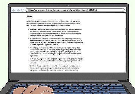 Learn the specific risks for the procedure during your initial consult. Ask your surgeon to tell you the risks that are associated with the surgery you're interested in. Brazilian butt lifts and tummy tucks are a few of the most high-risk surgeries so ask questions about how the surgeon performs these procedures and what complications can happen. If you don't understand a complication or medical term, ask them to explain. Some common cosmetic surgery risks include infection, bleeding, bruising, fluid buildup, and scarring. Since the risks vary depending on the type of surgery, it's important to have a discussion with your surgeon about your specific risks.