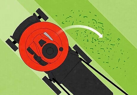 Throw any clippings into the previously cut row. Wallace says that finely cut clippings help fertilize grass, so leave them scattered thinly throughout your lawn when possible. If you have a side-throwing mower, send the clippings onto the row you just cut. Don’t leave clumps of cut grass sitting on your lawn, though — this is more likely to happen if you have a dull blade or if the grass is damp, Wallace warns. Either bag your clippings or use a rake to spread the clumps out. Reduce your lawn's thatch by using a bag that attaches to your lawnmower to catch the grass clippings. Add the clippings to your compost pile, use them as mulch, or dispose of them in a curbside trash or composting system.
