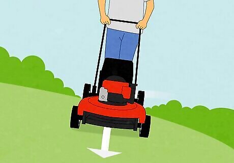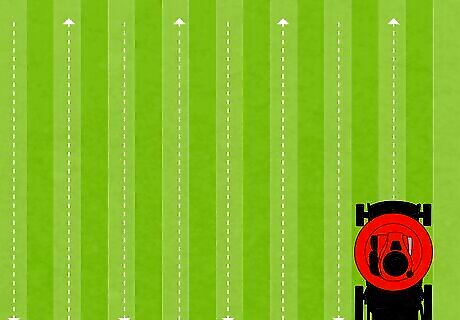 Move across sloped ground with a push mower. Mowing up and down a slope with a push mower may cause you to lose control. Never mow up and down a slope that’s anything more than gentle. Instead, go in straight lines that are perpendicular to the slope. Take any sloped ground into account when creating your rectangular mowing areas. If you have trouble walking up or down the slope on wet grass without the mower, don't mow up or down it even when the grass is dry. Manual push-reel mowers are less dangerous than larger and heavier powered models on slopes, but injuries still happen if you slip and fall. Driving a riding mower side to side on a steep hill may cause it to tip over. Go up and down gentle slopes. Instead of mowing a steep slope, try using a string trimmer, or consider planting or placing something other than grass in that area.