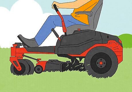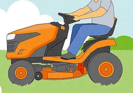 Riding Mowers, Lawn Tractors, & Garden Tractors When using a riding mower, sit in the lawn mower’s seat before starting the engine. Push down on the brake, pull the choke out, and turn the key to start. After the engine starts, push the choke back in. Use the shift lever to put the mower into low gear, take your foot off the brake, and press the drive pedal until your mower is going as fast as you'd like. Steer a traditional riding mower with the steering wheel by turning counterclockwise to go to the left and clockwise to go to the right. Drive the mower to the grass you want to mow and put your foot on the brake to stop. Lower the blade using the knob or lever marked “power liftoff” or “blade engage” on the console. Take your foot off the brake and press down on the drive pedal to begin mowing. When you reach the end of a row, continue past the end of the end of the unmowed area and turn around in an area you’ve already mowed to keep your rows straight.