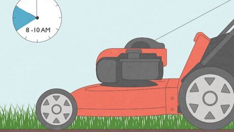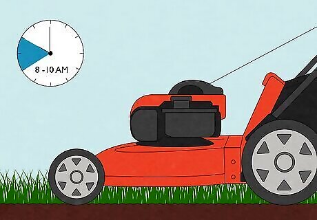 Mow your lawn between 8:00 am and 10:00 am on a dry day. Mid-morning is the best time to mow because it gives the dew a chance to evaporate, and the grass won’t be limp after midday heat. Limp gras bends under the mower blades instead of being cut, leaving your with an uneven lawn. Wet grass clogs your mower, causes fungal diseases, and leaves behind clumps of wet grass that kill your lawn. Plus, wet soil is softer and harder to mow. Checking the weather forecast and planning to mow before rain or after your lawn dries out reduces clumping, lawn damage, and heat stress on the grass (and you). Mowing wet soil may also pull out your lawn by the roots, leaving dead or patchy areas.