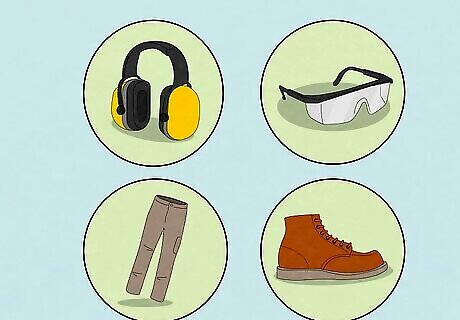 Put on protective eyewear, ear coverings, and clothing. Wear safety glasses to protect yourself from flying debris, and use ear protection to muffle the loud mower engine. Also, put on closed-toe, sturdy footwear and long pants to protect your feet and legs. Put on sunscreen and wear a hat, even on cloudy days or if it's early or late in the day. Make sure your ear coverings protect your hearing while allowing you to hear warning sounds, such as a car horn or a person shouting. Be sure to stay hydrated and take breaks if you're mowing a large lawn, feel overheated, or start to feel tired.
