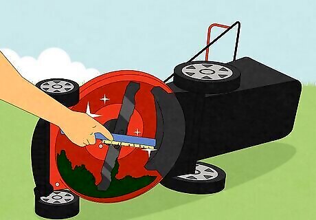 Sharpen your mower blades 1-2 times a year. Expect to sharpen your mower blades 1-2 times per year, depending on how often you mow, Wallace recommends. If you have warmer weather year-round, you may mow more often than someone with cold weather for part of the year. Dull mower blades cause jagged cuts in your grass. Jaggedly cut grass develops brown tips and invites grass diseases. A sharp blade makes a cleaner cut, says Wallace. If your lawn looks ragged after a mow, it’s probably time to sharpen your mower blades. Remove and sharpen the blades yourself with a few tools and some mechanical know-how, or search for "lawn mower sharpening near me" to find local pros. Even if your blades don’t seem dull, inspect them for damage every 3-4 mows, and rinse away any built-up grass debris on the blades and underside of the mower with a garden hose. Wallace recommends unplugging the spark plug to safely check the mower blades.