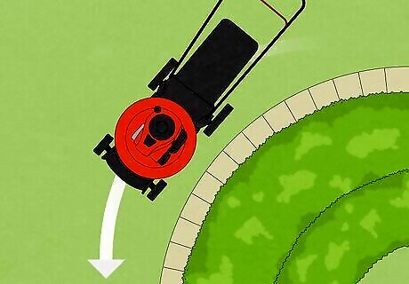Mow around the perimeter and any obstacles first. Unless you already have a square or rectangular lawn, create a squared-off mowing area. Go around trees or along curved planting beds, then create straight lines and angles in those areas. Turn your remaining lawn into one or several rectangles for easier mowing. Mowing around the perimeter first helps you square off the lawn and gives you room to turn as you mow back and forth in rows. Go around the perimeter twice to create a wider turning area.