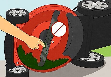 Don’t use your hands to remove grass clippings or other debris stuck in the blades. Instead, turn the mower off and use water from a garden hose to dislodge the blade of a gasoline-powered mower. Disconnect the spark plug to make sure the engine can’t start for any reason while you’re removing clogs. The mower blades may spin for a short time after you turn off the mower. Make sure they’ve stopped before turning the mower over.