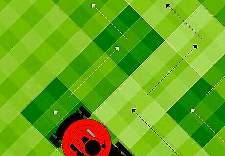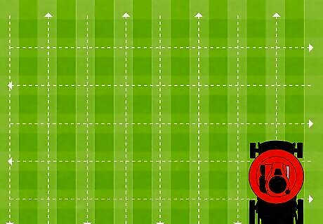 Create checkerboard stripes by mowing in perpendicular rows. To create a checkerboard-style pattern of alternating light and dark squares of grass, you simply need to mow over the same area twice. First, mow in your standard back-and-forth lines — for instance, north and south. Then, mow over the same area in east and west lines back and forth. When you’re done, you’ll see the distinctive checkerboard pattern. Finish the job by going around the perimeter again at the end to clean up any irregularities caused by your turns.