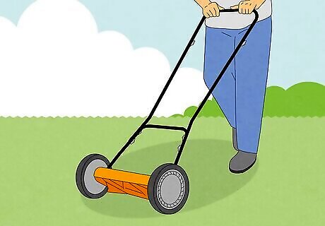 Manual Reel Mower Reel mowers are the simplest type of lawnmower to operate. Simply push the mower in a straight line across the area you’re mowing. Walk at a steady, comfortably brisk pace, or the mower may bind up and skid. When you’re done mowing, carefully rinse away any grass clippings that are stuck to the blades. The taller the grass, the harder it is to push a reel mower. Try to mow your grass once a week to avoid the grass growing too long to mow comfortably at an even pace. Reel mowers tend to roll over tall weeds instead of cutting them. If you have a weedy lawn, get rid of the weeds before you mow.