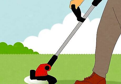 Use your string trimmer and/or edger after you finish mowing. String trimmers or edgers aren’t as fast or efficient as mowers. Rely on your mower to cover as much of the lawn as possible. Then, use a string trimmer or lawn edger to get at the remaining grass the mower missed. However, some people prefer to trim/edge first so that the clippings are chopped up and spread out by the mower. This is a viable option, but you may spend more time trimming and/or edging than necessary. These methods tend to be harsher on your grass than mowing — e.g., it’s easier to cut the grass far too short in spots.