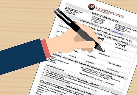 Fill out the application form. In addition to your documentation and letter requesting the copy, you need to submit the “application for a certified copy of a Delaware birth certificate.” For the application to be complete, you must fill it out to the best of your knowledge and sign it. The application is available online at http://dhss.delaware.gov/dph/ss/files/birth.pdf.
