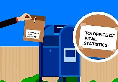 Send your application to the Office of Vital Statistics. Once you've collected all of your required documentation, send your application to one of the three Offices of Vital Statistics. Send your application to one of the three Offices of Vital Statistics at the following addresses: Jesse S. Cooper Building, 417 Federal Street, Dover, DE 19901; Chopin Building, 258 Chapman Road, Newark DE 19702; Thurman Adams State Service Center, 546 South Bedford Street, Georgetown, DE 19947. Consider sending the application materials by registered mail so that you can ensure that it arrives at the Office of Vital Statistics.