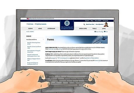 Visit the USCIS Forms website. The USCIS Forms website gives you free access to almost every immigration form you could possibly need. To access this database, visit the USCIS website and click on the "forms" link, which is on the top left-hand corner of the homepage. Once you click on the "forms" link you will be taken to the main forms page where you can search for your forms.