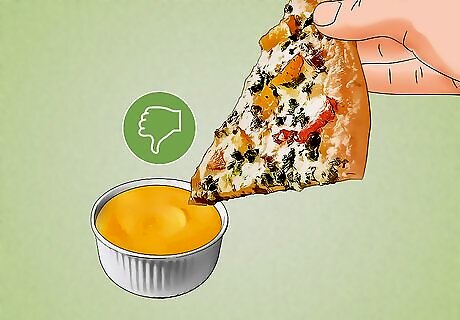 Skip the dipping sauces to cut out unnecessary calories. High-calorie dipping sauces may taste good, but they can rack up calories quickly. Instead of ordering ranch or a garlic butter dipping cups, eat your pizza sans extra sauce. If you really don’t want to forgo dipping sauce, try a healthier alternative, such as a Greek yoghurt ranch dressing. You can save around 200-250 calories by skipping the garlic or ranch dipping cups.