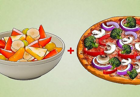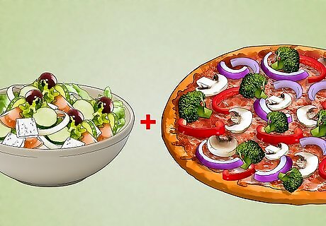Add healthy side dishes to help you feel fuller. Opt for a salad or fresh veggies instead of garlic bread or cheesy breadsticks to balance the meal. This way, you’ll only need to eat 1-2 slices of pizza and still feel full! If you take your pizza home, you could also make your own salad or eat a side of fresh carrot sticks, broccoli, or cucumber slices. To make the meal even healthier, opt for a lower-calorie salad dressing, such as balsamic vinaigrette, over ranch or caesar dressing. Eat your salad before you dig into the pizza to fill up on veggies first!