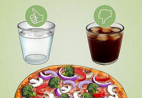 Choose water instead of soda to drink with your pizza. Skipping soft drinks is an easy way to avoid adding extra calories, caffeine, and sugar. Instead, go for bottled water or just drink a glass of water if you eat at home. You should also avoid sodas that claim to be zero-calorie or sugar-free, since they can contain potentially harmful artificial sweeteners.
