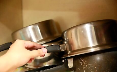 Organize your pot and pan supply. Before you begin to find a home for the lids, take inventory of what you currently have and use. Discard any sets that are damaged, peeling or cracked. Match a lid to each pot or pan.