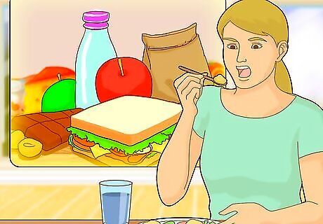 Eat well, especially at the beginning of the day. The body and the mind work in tandem, and if your body isn’t fed, your brain will suffer. Include protein, fat, complex carbs, and fiber in your diet. Leafy greens have a lot of iron and other beneficial vitamins and minerals in them. Make sure to eat whole grains to avoid a sugar rush. Coffee, tea, and energy drinks can help when you’ve had a bad night’s sleep, but a dependence on caffeine can cause you to be more sleepy in school. Try to use these things sparingly.