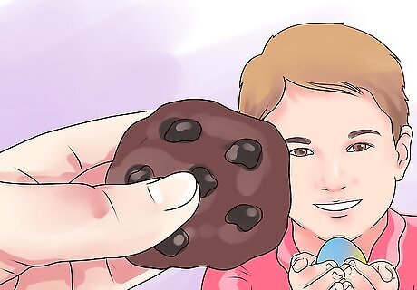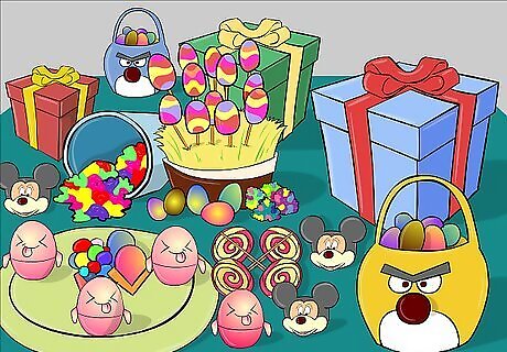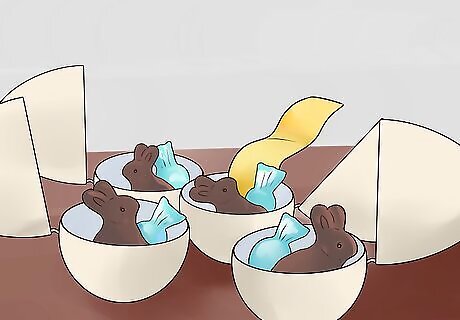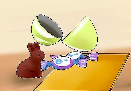 Place candy, Easter eggs, or other treats inside plastic eggs. For garden or yard hunts, if your garden or yard is not wet, slushy, muddy, or snowy, then you can forgo the plastic cover and put the treats out as they are, in their own packaging.