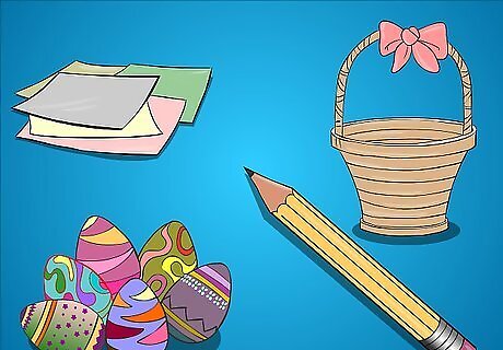 Assemble the items needed. You will need a glass jar or basket, a handful of small or varied size chocolate eggs (dyed hard boiled eggs can work too), paper pieces, a pencil and an Easter Basket.