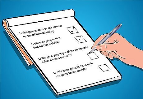 Read through the games in the following sections before selecting them. When choosing a game, keep the following considerations in mind: Is this game going to be age suitable for the children attending? Is this game going to fit in with the time available? Is this game going to give all the participants a chance to be a part of it? Is this game going to fit in with the party theme overall?