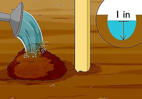 Soak the soil with water to settle the bulbs. Use a watering can or a hose to douse the bulbs in about 1 in (2.5 cm) of water from your watering can, leaving the soil soaked. The water helps to squish the soil onto the bulbs and makes them root. Try not to let any water puddle up on top of the soil to preserve the freshness of the bulbs.