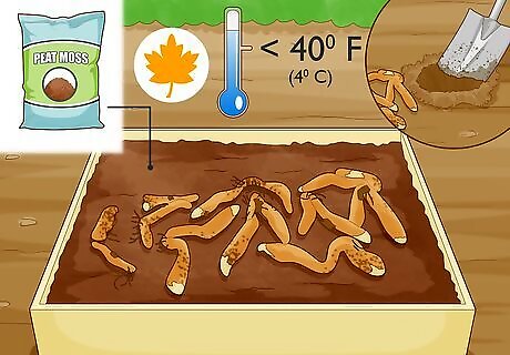 Dig up each bulb and place it in a bed of peat moss in the fall. Once the temperature falls below 40 °F (4 °C), use a gardening spade to carefully dig up your bulbs. Place them into a box full of slightly damp peat moss and store them in a cool, dry place for the duration of winter. Keeping your bulbs inside prevents them from dying in the cold temperatures. If your bulbs are in pots, you can leave them in their pots and keep them inside for the winter.