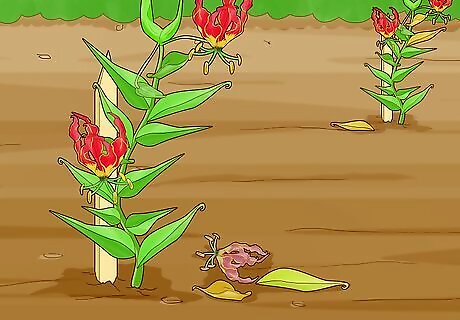 Remove weeds and cover roots to keep pests away. If any small weeds crop up around your bulbs as they sprout, gently pull them out by hand without disturbing the roots of your gloriosas. If you notice any disturbances around your bulbs from deer or squirrels, place some rocks over the roots of the bulbs to keep them out of reach. Since gloriosa lilies taste bad, most garden pests stay away from them.