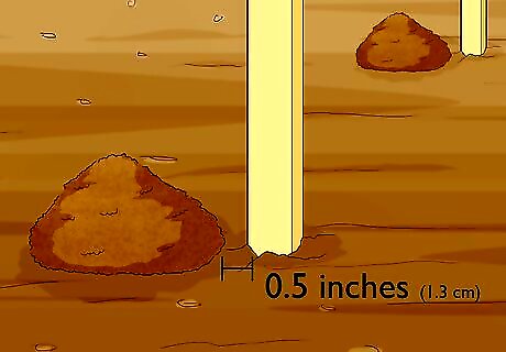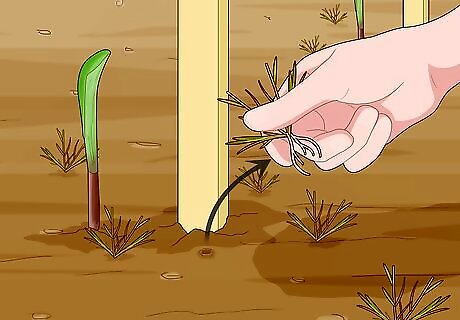 Add stakes to encourage vine growth near each bulb. Gather some thin, wooden or metal stakes and place them about 0.5 inches (1.3 cm) away from each bulb sticking upright. Pound them about 1 in (2.5 cm) into the dirt so that they stay standing up. You can find wooden stakes at most garden supply stores.