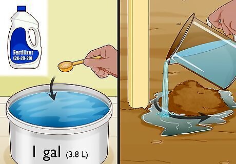 Add a half-strength fertilizer every 2 weeks. Purchase a 20-20-20 fertilizer and mix 1 tsp (14 g) of it with 1 gallon (3.8 L) of water. Pour the fertilizer mixture in a circle around each bulb, being careful not to disturb any sprouts if there are any. Fold the fertilizer into the soil with a small gardening rake to give your bulbs some added nutrients. You can purchase fertilizer at most gardening stores. Diluting your fertilizer lessens the likelihood of damaging buildup around your bulbs.