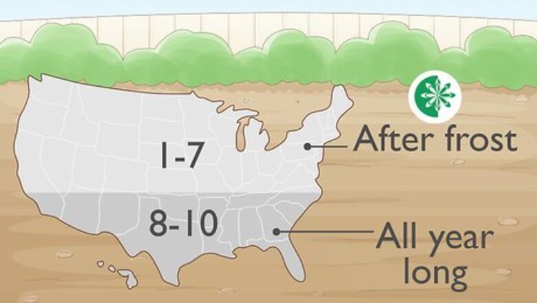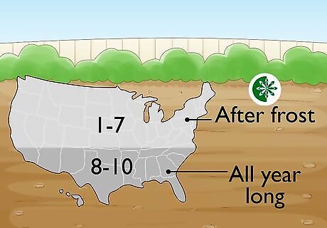 Plant your bulbs in the late spring or early summer. Make sure the threat of frost has passed in your region before you plant your flowers. If you are afraid your region might get frost again, consider planting your bulbs in pots to keep them indoors. In warmer zones of the United States, like zones 8 through 10, gloriosa bulbs may be able to survive all year long. In colder zones, like 1 through 7, they need to be planted in the spring time after the threat of frost has passed.