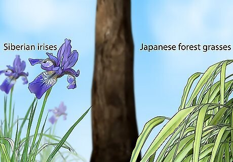 Opt for small plants to minimize disturbance to the tree's root system. Small plants require smaller holes to be planted in, which will cause less stress to the tree above them. Aim to buy plants with coin-sized bulbs that you can tuck in between the tree's roots. If you want to create a bold effect, plant many small plants instead of fewer big plants, choosing from options like: Siberian irises, violet-colored flowers with delicate petals Japanese ferns, small plants with silvery-green leaves Columbines, small plants with colorful bell-shaped flowers Japanese forest grasses, elegant clumps of grass with small blooms
