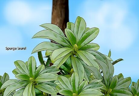 Choose leafy plants with interesting foliage to fill the space year round. Most flowers don't bloom year round, meaning that there may be a lack of color and texture under your tree through most of the year. To compensate for this, choose some leafy plants with different colors and shapes of foliage to create visual appeal all year long. Some examples include: Ruscus aculeatus (also known as butcher's broom), a plant with long, spiny foliage. Daphne laureola (also known as spurge laurel), a plant with dark green, leathery leaves. Japanese laurel 'Crotonifolia', a plant with large, glossy, yellow-speckled leaves. Continus 'Flame', or Cotinus coggygria, a plant with light green leaves that turn orange or red in autumn.