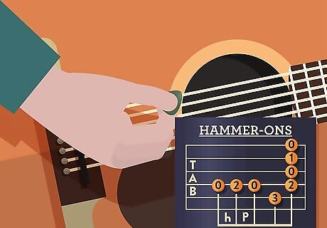Use hammer-ons to quickly blaze up the fretboard. A hammer on is when you slam your finger down on the fret so that it sounds out without picking. They are a great way to add subtle notes to your lead lines and solos and increase note speed. They also pair excellently with pull-offs, which can allow you to play three notes with only one strum. The "h" means you hammer onto the fret immediately after the "h": |e|---------------------0----| |B|--------------------1----| |G|--------------------0----| |D|----0h2p0--------2----| |A|---------------3----------| |E|--------------------------|