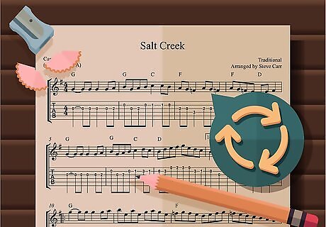 Use the major and minor pentatonic scales to start working your way down the neck. Most solos, as evidenced above, tend to stick to the top of the guitar. But if you're really serious about lead guitar then you already want to stretch further down the neck into new territory. Luckily, the most common guitar scales -- the major and minor pentatonic scale -- will work wonders. A common, but difficult, skill is to change the scale to match the chord being played. So, for an A chord, you play the A-major pentatonic, then move to the C-major when switching to the C chord. This requires in-depth knowledge of every note on the fretboard. If you're serious about bluegrass guitar, you must spend time learning the music theory behind the CAGED system, which helps map the fretboard. Still feel like stretching your musical muscles? Dive into the mixolydian mode for bluegrass solos as well.