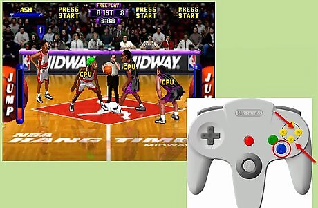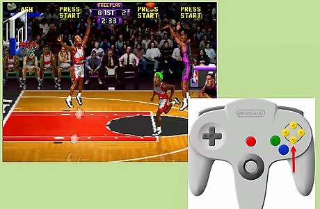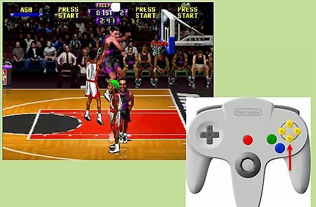 To shoot, press the down C button, to dunk, hold A and run up to the hoop and press down C. The better your dunk rating, the better your dunks are and the farther away you can dunk from. It's easiest to make shots while holding down the A button while shooting. Right C is pass.