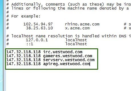 Copy the following lines into the hosts file: 147.32.118.118 irc.westwood.com 147.32.118.118 gameres.westwood.com 147.32.118.118 servserv.westwood.com 147.32.118.118 apireg.westwood.com