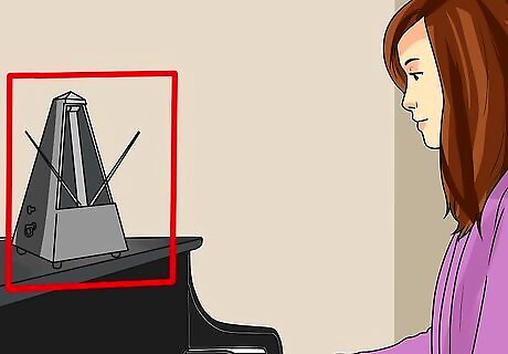 Practice with a metronome. Metronomes keep a constant rhythm for you, helping you stay in time as you practice. Most musicians will unconsciously play parts they know faster and slow down for parts they don’t like. This may seem fine when you are on your own, but if you try to do this with a band the entire group will fall out of sync. Start slow, around 60 BPM (beats per minute) if you are not used to using a metronome. Some music charts will list a BPM on the top, so set your metronome to this number to practice the song correctly.