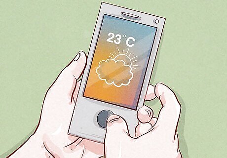 Check the forecast to prepare for any rain or inclement weather. Ideally, you'll be camping in sunny or cloudy weather, but it's a good idea to look at the forecast for the weekend before you go. If you know there will be inclement weather, think about which camping location you choose—a campsite on low ground won't keep you as dry as a campsite on higher ground with lots of trees to protect you from the rain. If there's a chance of rain, make sure you have clothing that will keep you protected, as well as any tent gear needed for the rain.