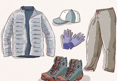 Plan your wardrobe so you're dressing in layers. Since you'll be in the outdoors during the day and nighttime, you'll likely experience a range of temperatures. Pack clothing you can take on and off, such as jackets, loose pants, hats, or gloves. Pack shoes that are easy to walk in, such as hiking boots, that will protect your feet. Bring a bathing suit if the weather will be warm, or winter coats and scarves if the weather is going to be cold. Bring a rain jacket if it's going to rain, as well as extra pairs of socks.