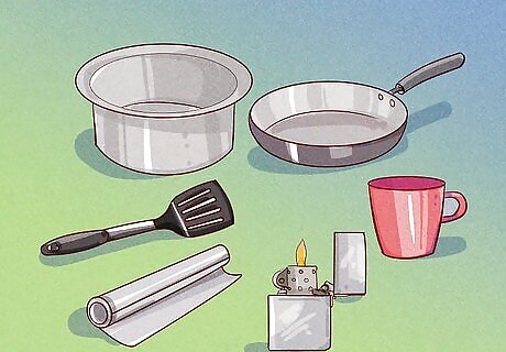 Bring kitchen tools if you plan on cooking your meals. This includes things like a skillet or pan, cups, utensils, spatula, a lighter, and foil. Think carefully about what you'll need to create each meal you've planned, and bring the necessary kitchen items. Bring a sponge to rinse off any dishes so you're not bringing them back dirty, or opt for disposable utensils and dishes. Other important items include paper towels, paring knives, storage bags, and roasting sticks for hot dogs or marshmallows.