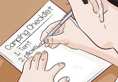 Use a camping checklist to ensure you don't forget anything. You can find lots of great camping checklists online, telling you everything you should bring to ensure a successful trip. Put things on your list such as a tent, extra tarp, sleeping bags, pillows, blankets, chairs, and flashlights. Other items you'll need are extra batteries, sunscreen, insect repellant, and your toiletries. Pack toilet paper and hand sanitizer in case there isn't any on the campgrounds.