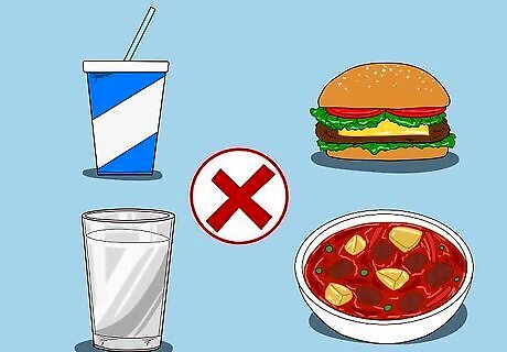 Don't eat or drink 8-12 hours before surgery. Your doctor will typically recommend that you fast before surgery. This is usually easiest if you have surgery first thing in the morning. Then, you can eat a filling dinner and sleep through the hours you're not supposed to be eating. If your surgery is scheduled later in the day, ask if there's something light that you can eat in the morning to keep from getting too hungry during the day. Usually you can continue to drink water, but don't overdo it. Make sure you're well-hydrated in the days leading up to your surgery so you don't feel the need to drink as much the day of.
